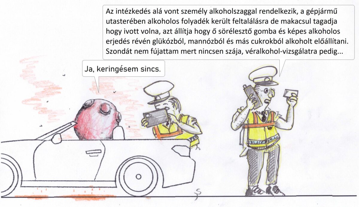 A fenti rendőrjárőr előtti elképzelt védekezés azonban még tőle is abszurd lenne, mi az, hogy nem ivott, hanem a szervezete termeli az alkoholt. Képtelenség!